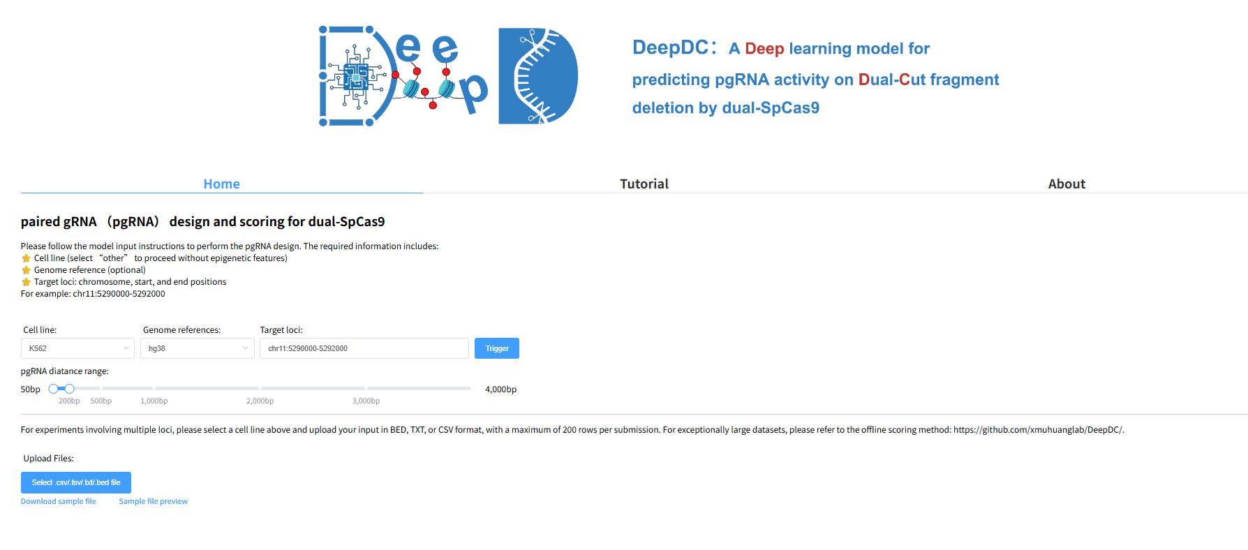 DeepDC, developed by Jialiang Huang's Lab at Xiamen University (XMU) and Teng Fei's Lab at Northeastern University (NEU), is a deep learning model for predicting pgRNA activity on dual-cut fragment deletion by dual-SpCas9. It combines a HyenaDNA block and XGBoost to extract epigenomic features and sequence information from each paired sgRNA and predicts editing efficiency.