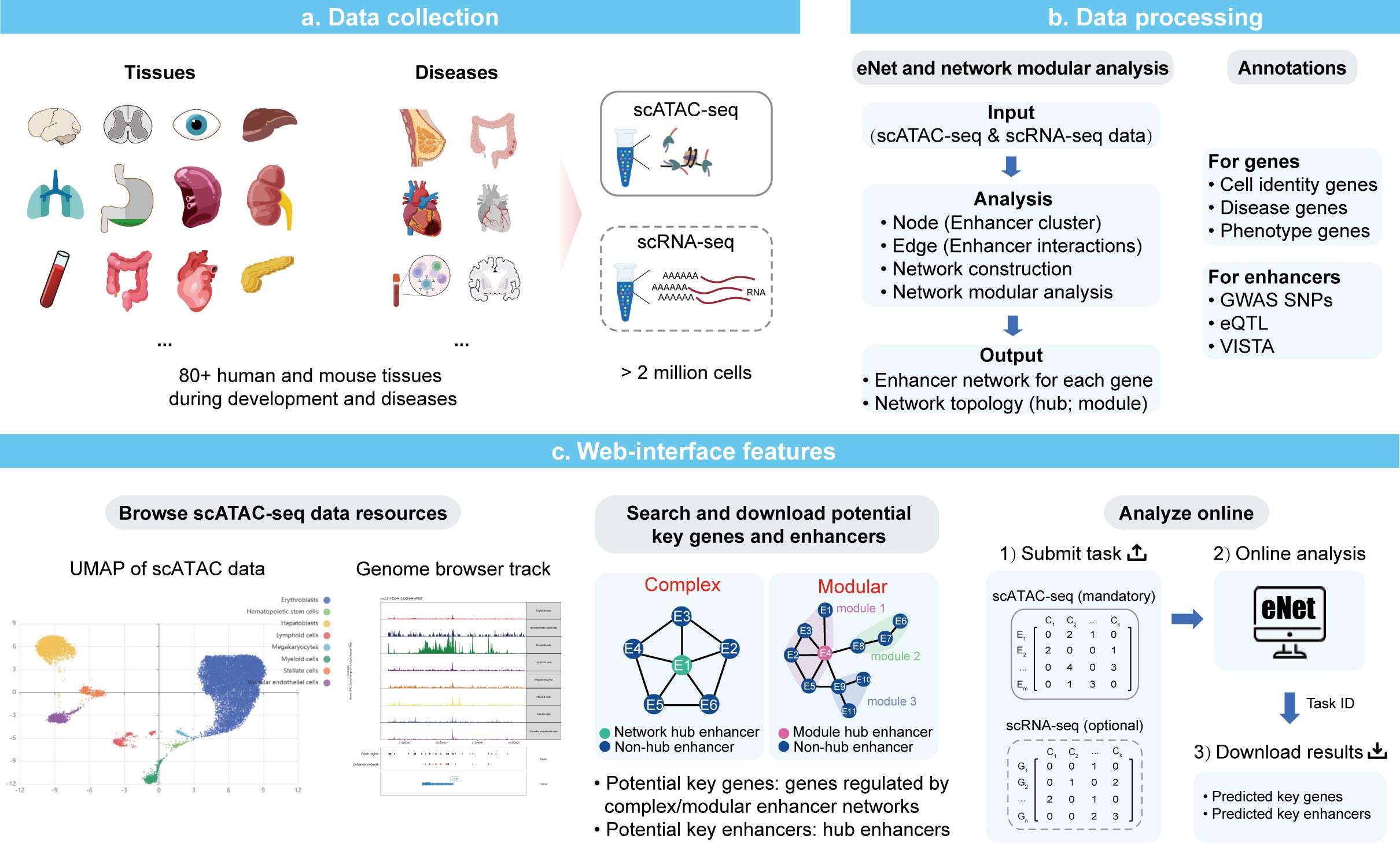 Repositories Webserver eNetDB is database provide potential key genes and enhancers under kinds of biological systems for experimental validation, covering 80+ tissues/cell types that include a large number of healthy/diseased tissues of human and mouse.