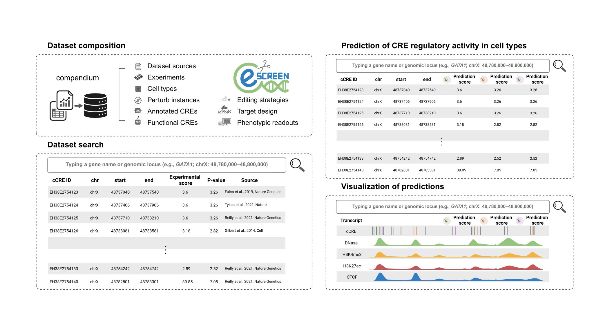 Software CRISPR eScreen is a sequence-sensitive model based on the Striped Hyena2 architecture that learns interpretable regulatory syntaxs and predicts activity. DeepDC is a deep learning model for predicting pgRNA activity on dual-cut fragment deletion by dual-SpCas9. Spatial and single cell eSpatial, a computational framework that deciphers spatially resolved enhancer regulation of gene expression by integrating spatial profiles of gene expression and chromatin accessibility. eMut, represents an integrative pipeline for detecting, imputing, and characterizing non-coding regulatory mutations with functional consequences at the single-cell resolution. eNet2.0, a comprehensive tool by introducing functions for network topology, comparative analysis, and dynamics, enabling systematic exploration of modular enhancer networks and their critical role in gene expression during development and disease. eNet1.0, an algorithm that constructs enhancer networks from single-cell multi-omics data to identify key genes and enhancers of cell identity and disease. Pesca, a computational method to predict and enhance spatial profiling of chromatin accessibility using scATAC-seq data. |
