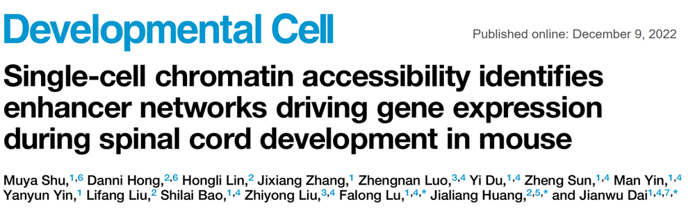 同时,实验室联合中国科学院遗传与发育生物学研究所的戴建武团队和陆发隆团队,将eNet算法成功应用于解析小鼠脊髓发育过程中的增强子调控网络,并利用小鼠体内增强子敲除模型揭示了Atoh1增强子调控网络在小鼠脊髓发育过程中的功能,验证了eNet算法的预测结果。相关工作的研究成果于2022年12月9日发表在Developmental Cell杂志,标题为Single-cell chromatin accessibility identifies enhancer networks driving gene expression during spinal cord development in mouse。