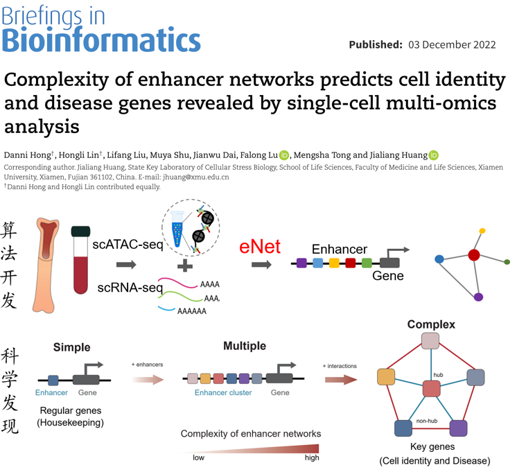 近日,实验室在Briefings in Bioinformatics上发表了题为Complexity of enhancer networks predicts cell identity and disease genes revealed by single-cell multi-omics analysis的文章,开发单细胞多组学分析算法eNet,通过整合scATAC-seq和scRNA-seq单细胞多组学图谱构建增强子调控网络,提出“增强子网络复杂度”的概念,并揭示一个基因表达调控的规律:基因对细胞命运和疾病越重要,则其增强子调控网络越复杂。