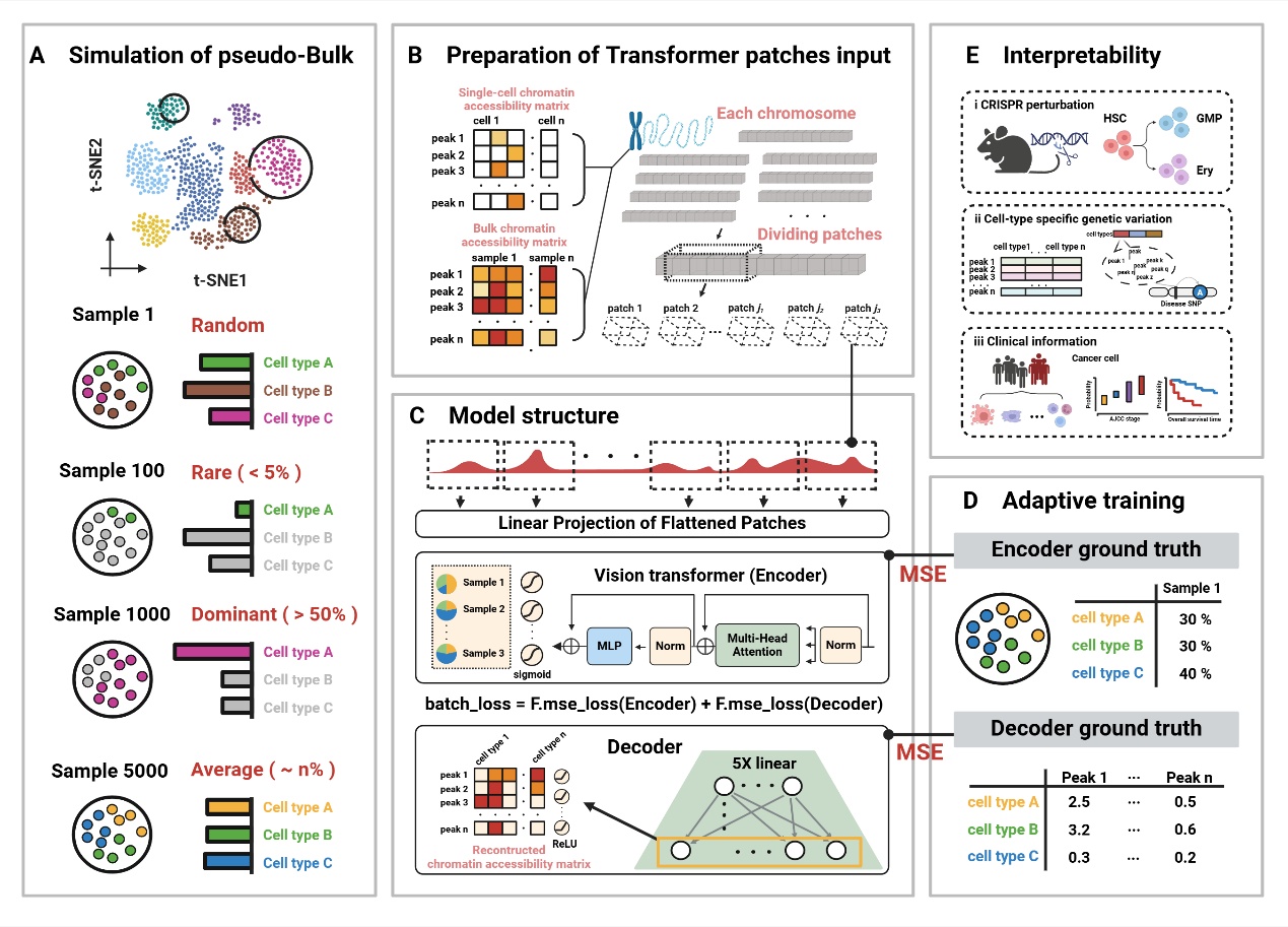 近日,实验室团队在《Briefings in Bioinformatics》期刊上发表了题为《DECA: Harnessing Interpretable Transformer Model for Cellular Deconvolution of Chromatin Accessibility Profile》的文章。该研究基于视觉转换器(Vision Transformer,ViT)架构,提出了一种先进的深度学习模型DECA(染色质可及性谱图的解卷积),旨在预测细胞类型的比例,并重建染色质可及性(图1)。